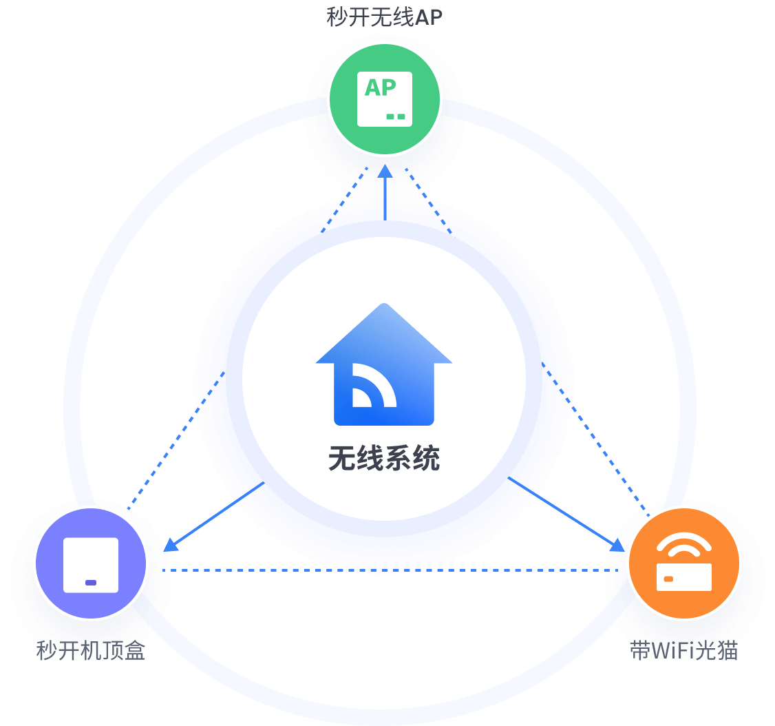 选择秒开无线AP、秒开机顶盒、带WiFi光猫三种设备任意一种或几种实施WiFi覆盖。