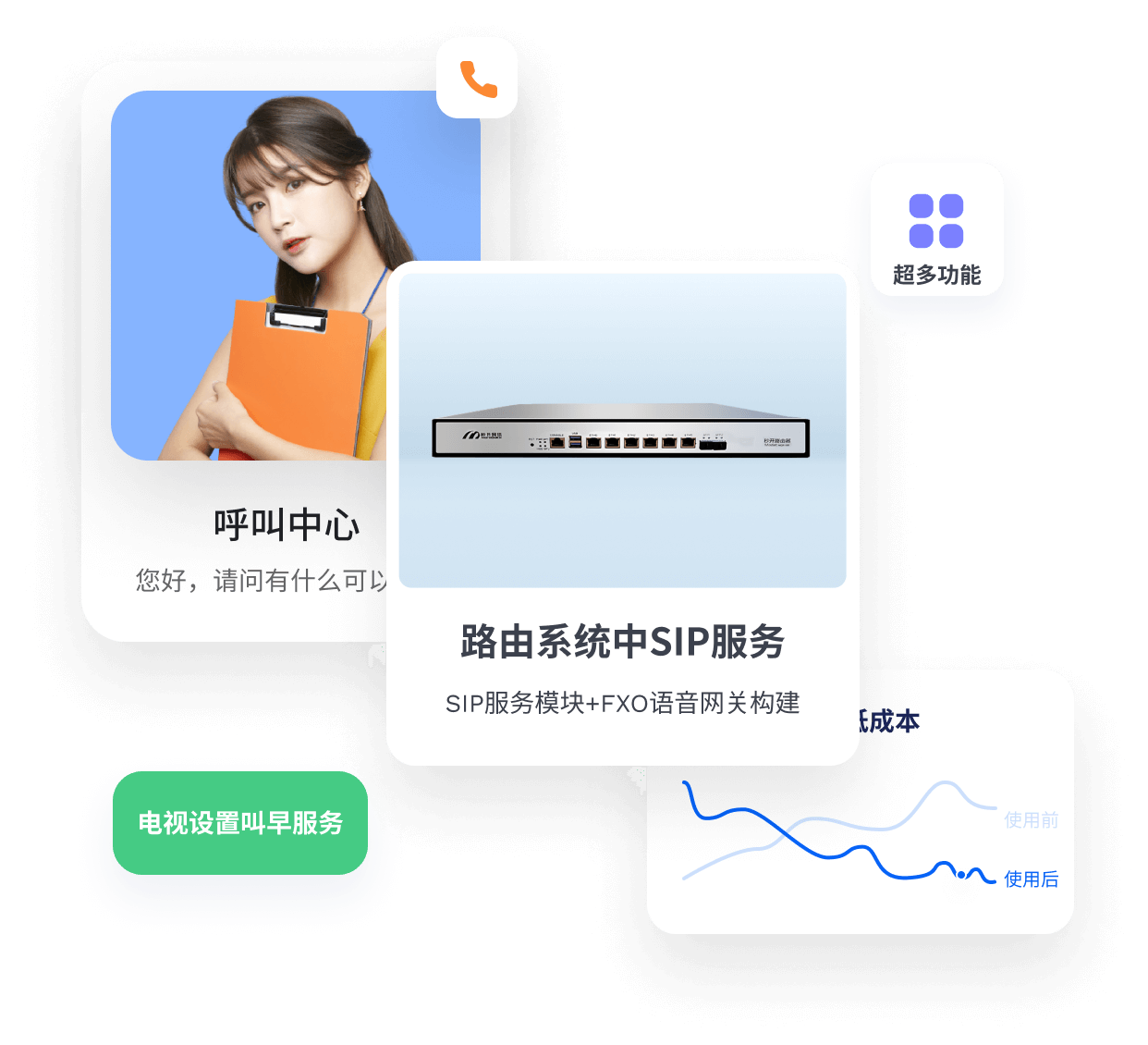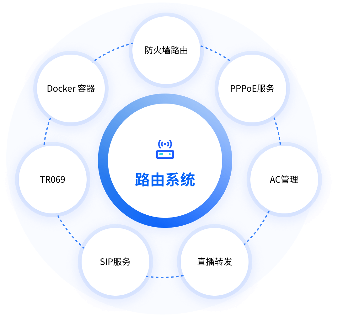 集成防火墙路由、PPPoE服务、AC管理、直播转发、SIP服务、TR069、Docker 容器等,可化身为:宽带路由器、AC服务器、VoIP服务器、ACS服务器、虚拟机平台等多种设备。;
