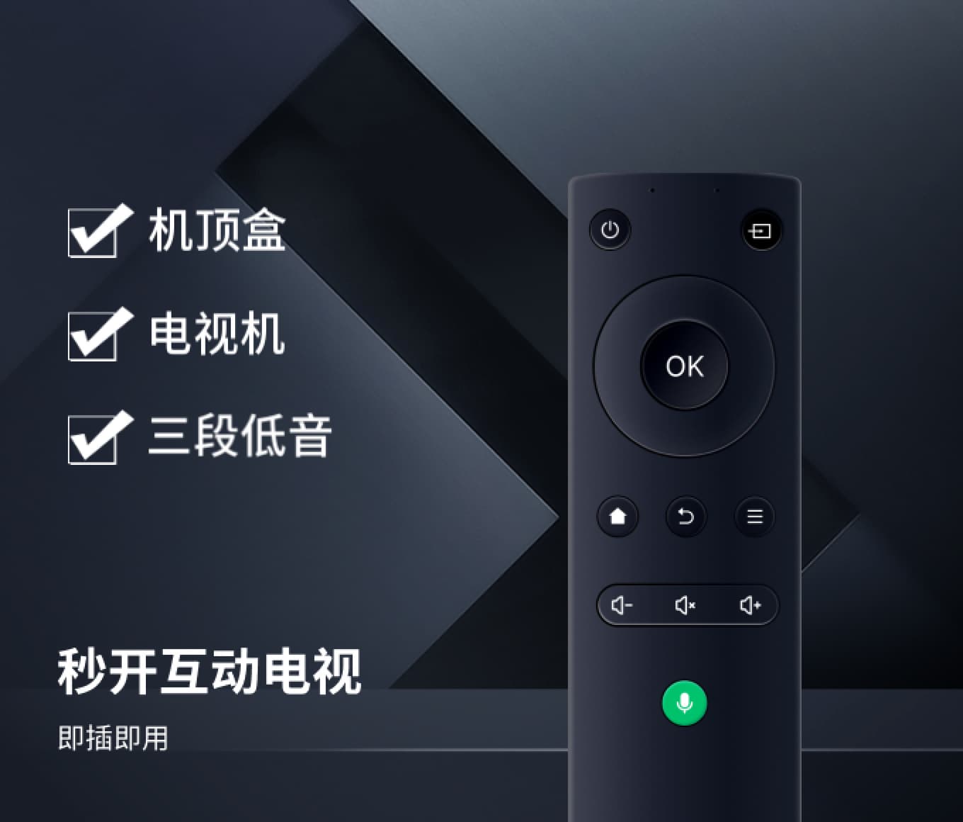 秒开AI语音遥控器是一款具有在线AI语音功能的无线遥控器,能与安装秒开互动电视APP的设备进行对接(机顶盒、智能电视机、投影电视等),即插即用,通过语音不仅可以控制电视换台,还可以控制灯光、空调等设备,是最为便捷经济的AI语音方案。