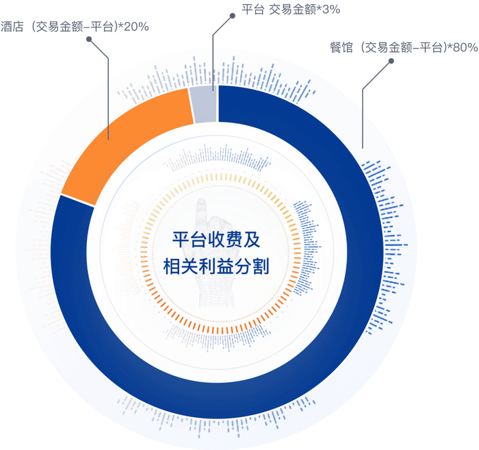 假设酒店与餐馆进行二八分账,即酒店占20%收款占比,餐馆占80%的收款占比。如客户点餐金额为100元,则平台收取3元管理费(100*3%),余额97元由系统按二八比例自动分配给二个收款人,酒店收入是19.4元(97*20%),餐馆收入是77.6元(97*80%)。